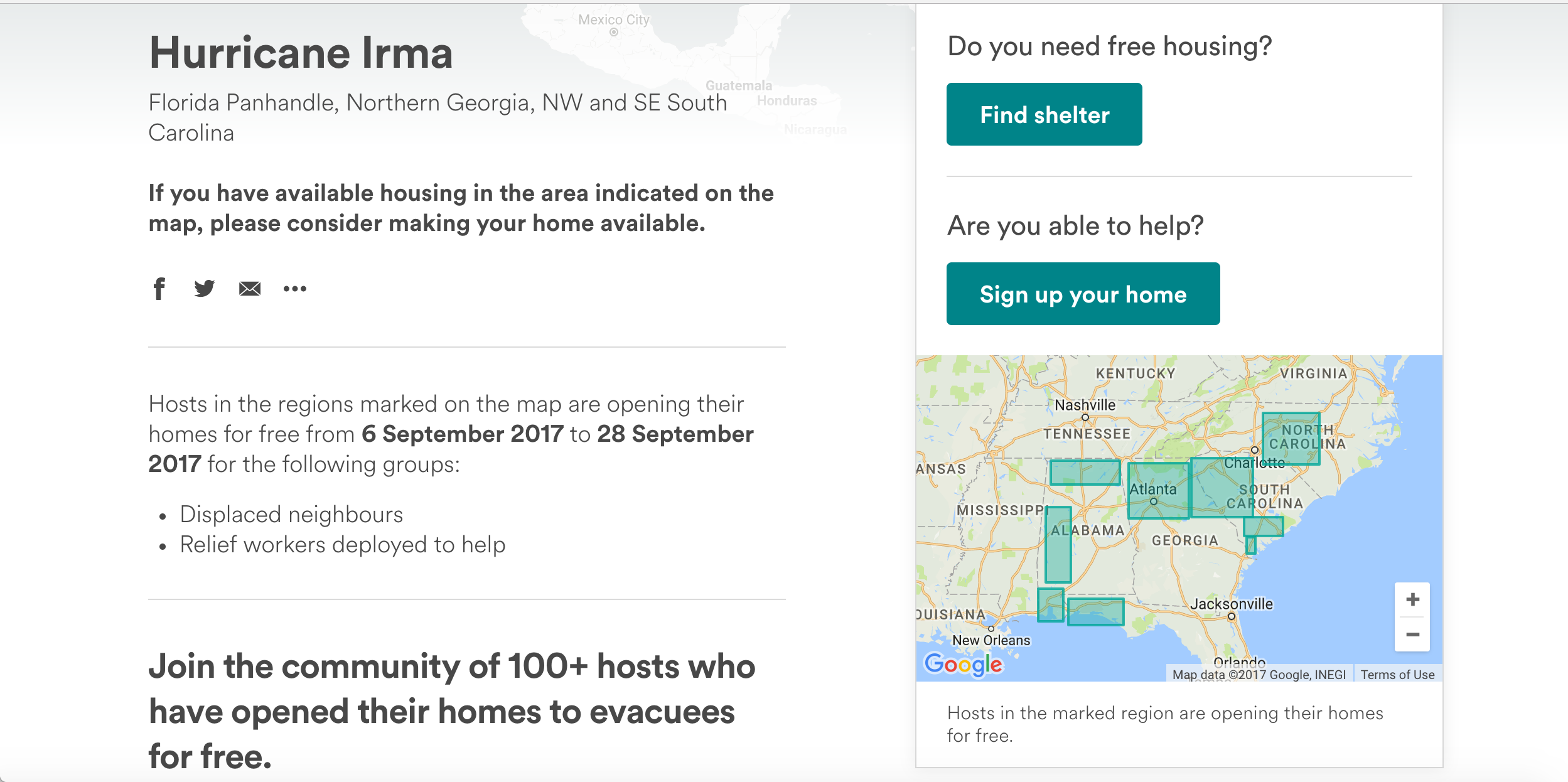 AirBnB, a popular site that facilitates apartment rentals online, has been helping people displaced by natural disasters find free places to stay since 2012. So, if you live in the Florida pan handle, Northern Georgia, or NW and SE Carolina, and would like to volunteer your home to evacuees, all you have to do is create an account with Air BnB. People in need will then be able to send requests. You can learn more at https://www.airbnb.co.uk/welcome/evacuees/hurricaneirmaevacuees
