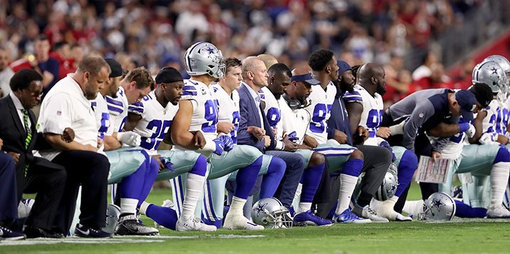 The protests of last weekend are the latest in a movement started by former 49ers quarterback, Colin Kaepernick in the 2016 season. Following the brutal murders of Alton Sterling and Philando Castile, Kaepernick sat out during the playing of the national anthem to protest police brutality and the treatment of blacks in America. The protests evolved to kneeling. Other members of the 49ers and other teams joined in, and the protests began to catch national attention.