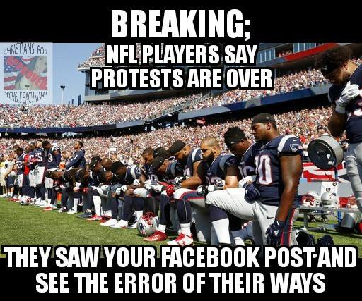 If the protests continue this weekend, I’m sure they will be used as fuel for ironic Facebook posts that point out all of the rights kneelers have as American citizens, yet shames them for exercising them.