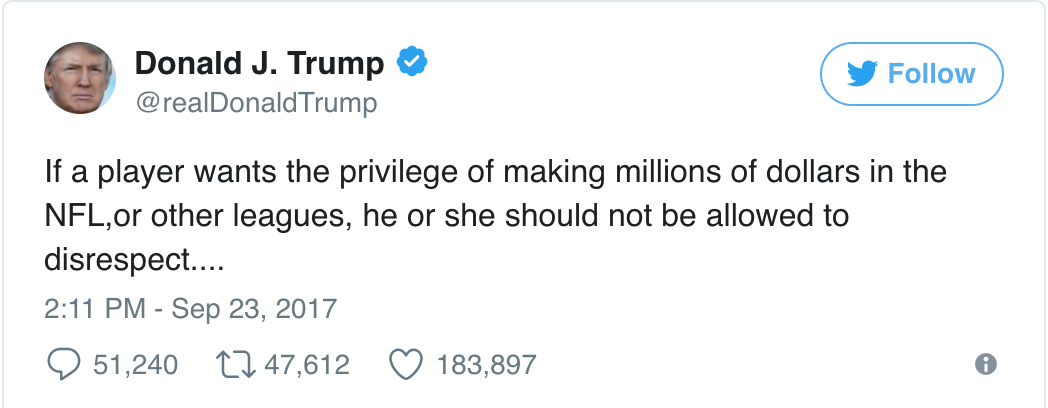Maybe you think the act of kneeling is misguided, or maybe you think it’s totally justified. However what should not be a point of debate is the fact that these players 100% have the right to protest. To demand that people stop protesting, or to imply that they should lose their jobs for exercising one of their fundamental rights peacefully is absolutely ludicrous and borderline authoritarian.
