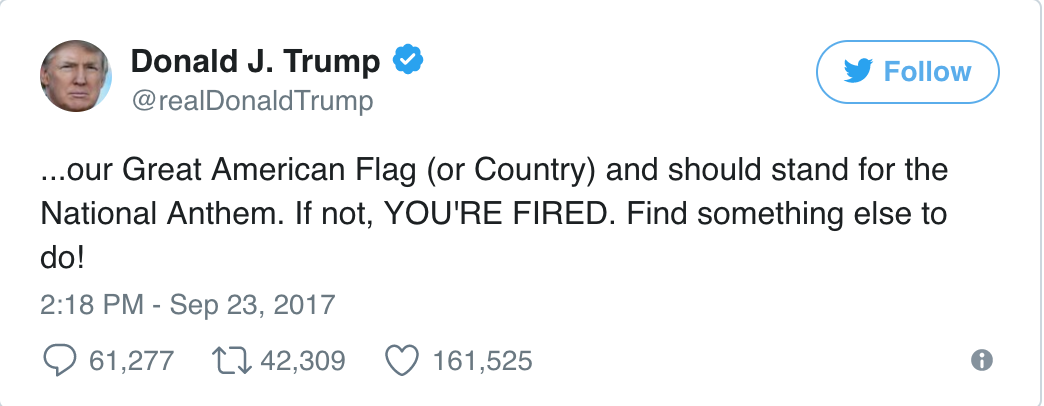 For so many people, the flag is so much more than just thirteen stripes and fifty stars. It represents our country and all of the freedoms it protects. It represents our loyal troops and all the lives sacrificed securing these freedoms. Thus, kneeling during the national anthem is a slap in the face to the armed forces. Coming from millionaires who have thrived in America, the insult seems even worse and ungrateful. Donald Trump has dusted off his signature catch phrase to call for the kneeling players to be FIRED.